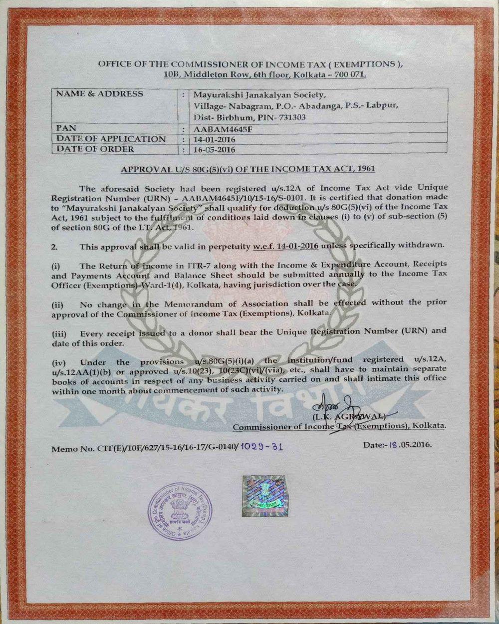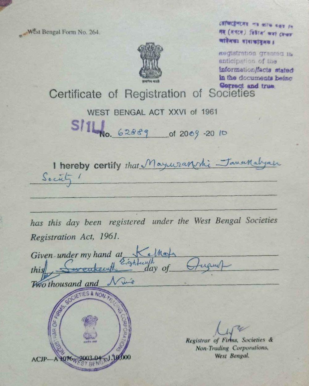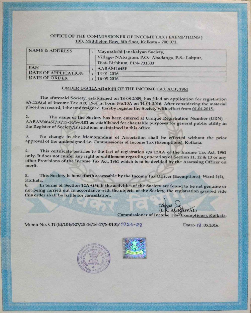 Document Gallery Mayurakshi Janakalyan Society Society Registration 12AA Certificate 80G Certificate Society PAN **Please Click the Links to See the Documents**